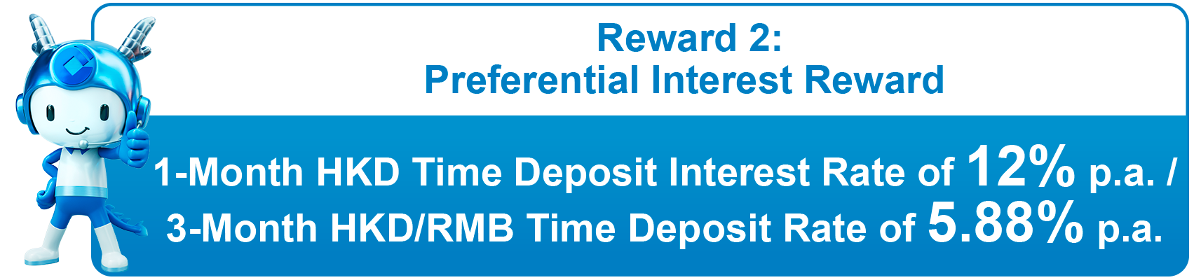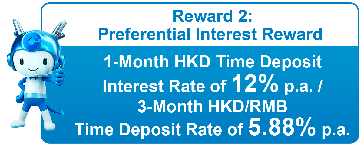 Note: Promotion 1 "Account Opening Cash Reward" and Promotion 2 "Preferential Interest Reward" can each only be enjoyed once. When participating in Promotion 2 "Preferential Interest Reward", customers can only enjoy one of the above time deposit offers once.