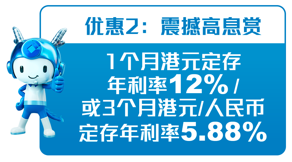 注:优惠1「开户现金赏」及优惠2 「震撼高息赏」仅限享用一次。 参与优惠2 「震撼高息赏」时,客户只可享以上其中一项定存优惠一次。