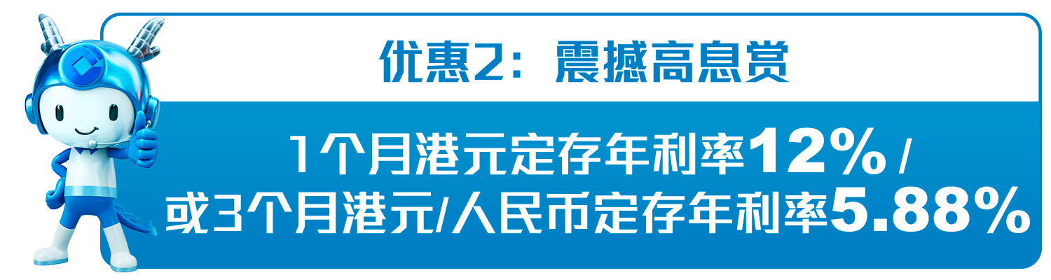 *请确保填写于网上登记表格上的资料正确无误。任何与银行纪录不符之差异,将导致定期存款设立失败。若客户提交多次网上登记表格,本行将以首次提交的有效填写版本的网上登记表格进行后续处理,后续之提交将会被视为无效。如有与优惠有关的任何争议,本行对与优惠有关的所有事项保留最终决定权,对所有有关各方均具有约束力。 - 完成第10 I条条款所列的所有任务之合资格客户(「完成任务之合资格客户」),方可享下列其中一项特惠定期存款年利率,而相关优惠仅限享用一次。