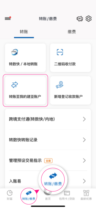 您亦可从内地其他银行,透过跨境支付通,向您于建行(亚洲)的账户汇入任意金额资金,即可避免账户成为不动户。您可登入「手机银行」查看您的账户号码。