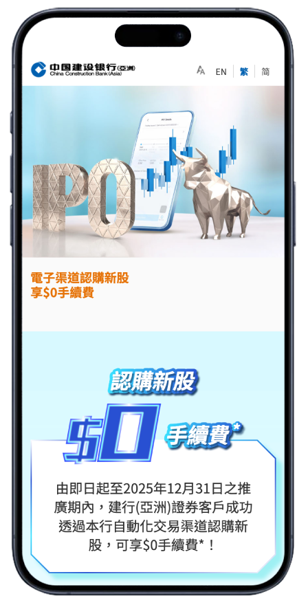 由即日起至2025年12月31日之推廣期內,建行(亞洲)證券客戶成功透過本行自動化交易渠道認購新股,可享$0手續費*!